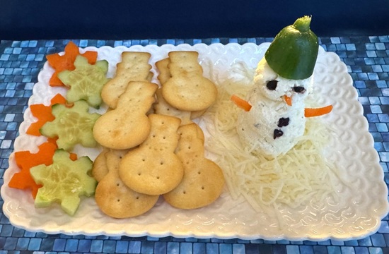 Snowman Cheese Ball: Softened cream cheese mixed with ranch dip dry mix, shredded Cheddar, and rolled into balls, Hat – cucumber, Arms and Nose – carrot, Eyes and Buttons – dried blueberry