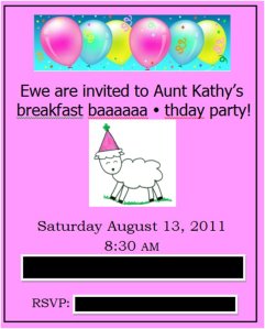 I spent a lot of time thinking about and researching invitations. Ultimately I created a simple invitation (see above) with a scan of my sheep drawing customized for the party. I decided to put more time into other items for the party (favor bags and place cards).