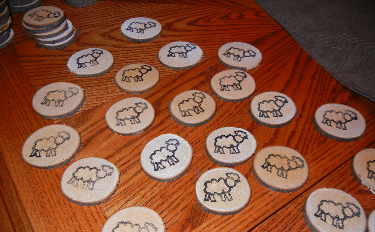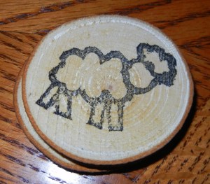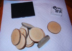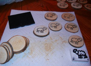 I wanted an outdoor activity for my Sheep Themed party. I thought it would be fun to use my sheep stamp on wooden discs. We carved the stamp several years ago. I thought we should have at least 12 discs per child. The disc needed to be at least 2 inches diameter to fit my sheep stamp. I was going to purchase wooden discs but my husband said he could make the discs. We ended up preferring the homemade discs.