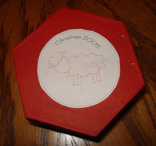 In 2005, I made a series of these ornaments for Christmas gifts. I bought paper boxes and painted them to match. Then, I attached a custom sticker to the top of the box.