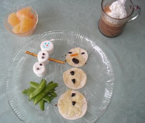 Two of my nephews (ages 7 and 9) spent the day at my house. We decided to make snowman themed lunches. We were inspired by this snowman pizza to make our own tortilla snowmen. We modeled the marshmallow snowman after this. The boys styled their own lunches. One nephew said, “Aunt Kathy since it looks so cool I don’t want to eat it”. They both enjoyed their lunch.