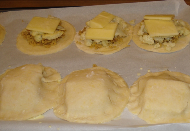 My Mom and I made Martha Stewart’s Roasted Cauliflower and Manchego Hand Pies as a test for a dinner party. The menu will be vegetarian. This recipe appealed to me as a vegetarian entree that could be satisfying for meat eaters. Also, it seems that many of the components for this can be made ahead.
