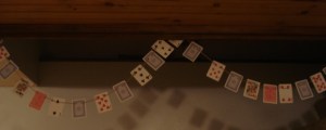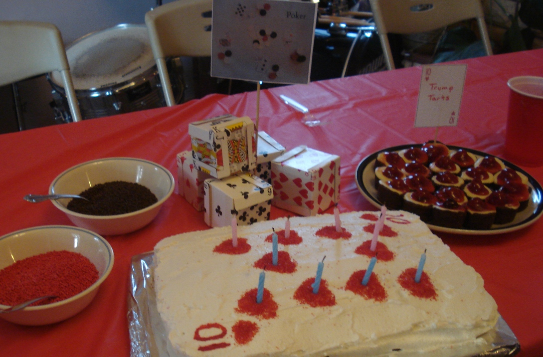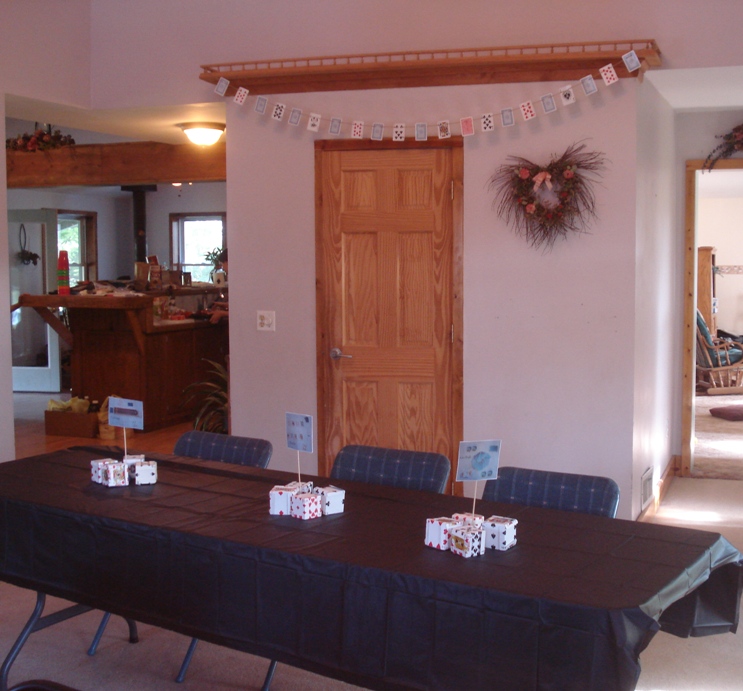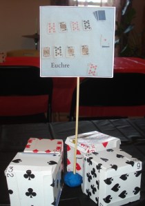 - Centerpieces: Card cubes with card game set-ups. We used these wonderful directions. The birthday boy set-up the card games and I took photos. We created set-ups for Cribbage, Euchre, Go Fish, Poker, Rummy, Sequence, Solitaire, and Tripoley. Then I printed out two sets for each type and taped them to bamboo skewers. We stood them up in balls of clay.