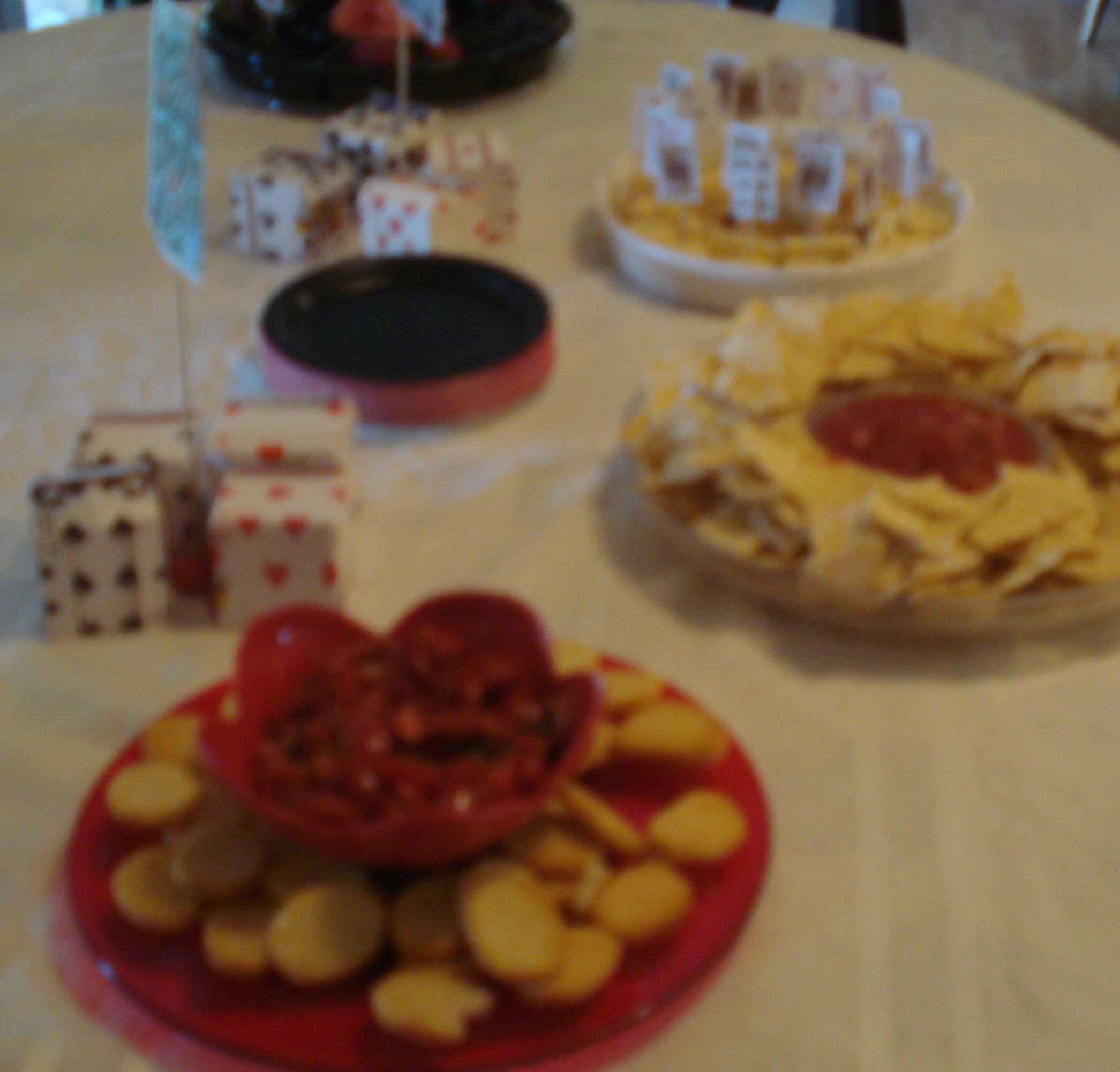- Cheese and Crackers: Pepper Jack and Cheddar cheese with playing card picks (I copied actual playing cards at 50% – printed out two sets, then taped them to toothpicks)