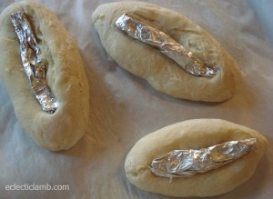 I made my french bread dough and tried different size canoes. I followed a similar method as my alligator. I sprayed aluminum foil with cooking spray and pushed into bread before second rise and baking.
