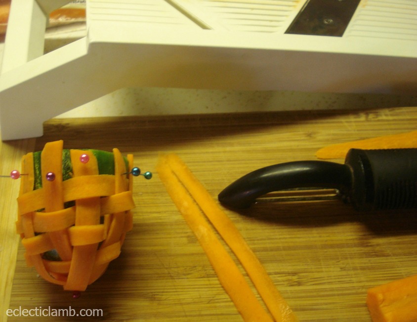 Cut carrot strips with a vegetable peeler. These will be the horizontal strips for the basket. Start at the bottom and weave carrot strips horizontally. Keep weaving strips until you get to the top of your vertical strips.