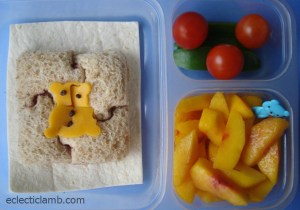 Sandwich: wheat bread, peanut butter, homemade low sugar raspberry jam, cheddar cheese, dried blueberries, and tortilla (to eat with the cheese bear).