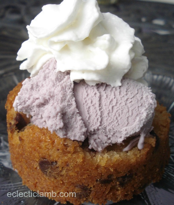 Black Raspberry ice cream topped with whipped cream served in a cookie ring