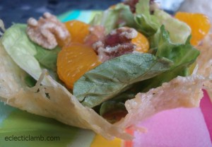 The Parmesan cup recipe is here from Food and Wine. My nephew designed the salad: romaine lettuce, mandarin oranges, toasted walnuts, and Wegmans Raspberry Vinaigrette.
