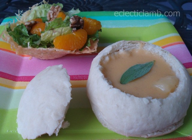 The bread bowl recipe is from Mel’s Kitchen Cafe. The soup is a Potato Cheddar Chowder from Vegetarian Times.