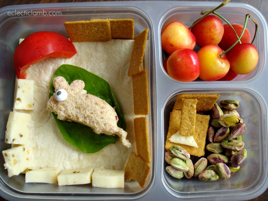 Mouse: wheat bread and pepper jack cheese sandwich with Wilton Candy eye on a spinach leaf