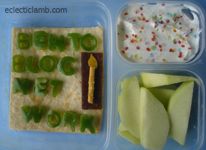 This week is the 1 year anniversary for the Bento Blog Network. In celebration I made this simple bento. I discovered Diana’s site about 6 months ago. I enjoy creating bentos to fit her weekly theme. Some of my most successful bentos were created for the Bento Blog Network weekly contest. Happy blogiversary Diana!