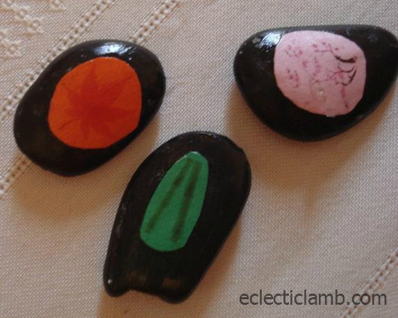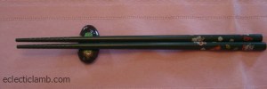 - Chopstick rests – We modified this idea. Instead of scrap booking rub-ons I printed out clip-art (maple leaf, cherry blossom and bamboo) and then used Mod Podge.