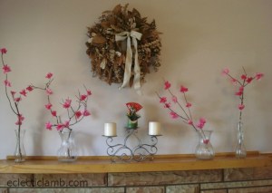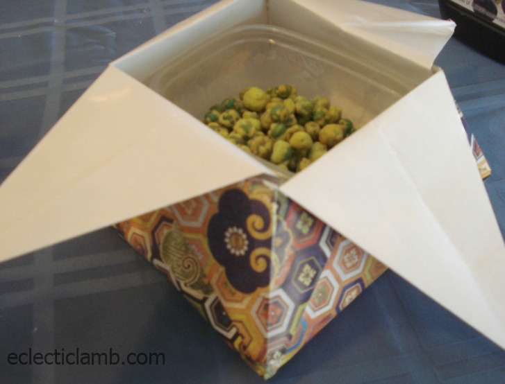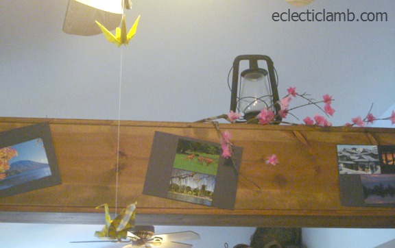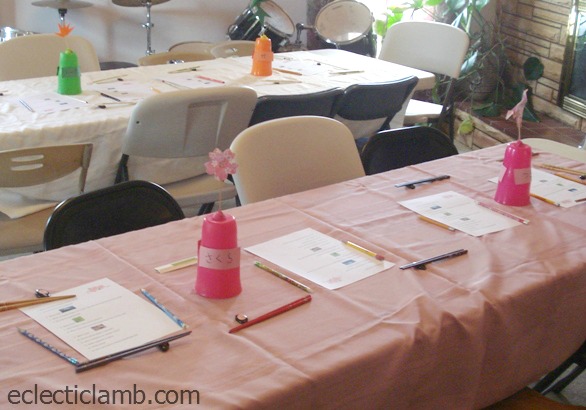 - Origami Nature Centerpieces – We used origami paper and folded bamboo, maple leaf and standing crane. We cut out a cherry blossom shape. I made labels for each nature in Japanese and taped to each cup.We attached the nature item on a stick to the top of a cup.