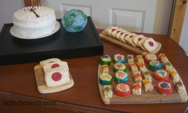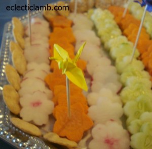 My niece had a Japanese themed birthday party for her 14th birthday party with family. The focus of the theme was nature (crane, maple leaf, cherry blossom, and bamboo). We planned an Americanized version of Japanese food because many of the party attendees are not adventurous eaters. The guests enjoyed the theme and food.