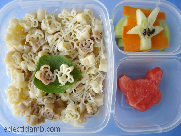 The Mickey pasta was a gift from my 10 year old niece. The watermelon was inspired by this cute bento from Bento School Lunches.