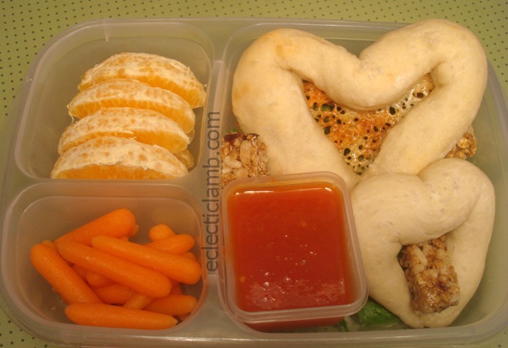 This lunch has a lot of orange and did not turn out like I imagined but it tasted great. It was my first time filling homemade pretzels with cheese. I tried goat cheese and cheddar. I preferred the cheddar pretzels. The pretzel in this lunch is the only one that had some of the cheese escape. I liked the way it looked.