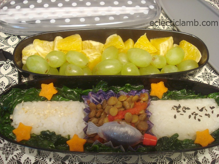 Bottom Tier: Onigiri (one with roasted white sesame seeds, one with black sesame seeds), spinach sauteed in a little bit of olive oil, carrot stars, soy sauce in fish shaped sauce holder, green lentils cooked in water with a Knorr Vegetable Bouillon and served with tomato