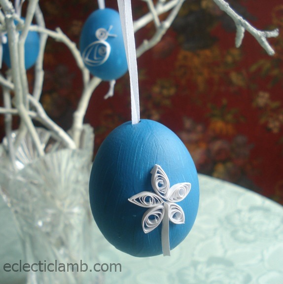 A few years ago, I gave my niece the Klutz Twirled Paper book for a birthday gift. She loves quilling. We decided to create quilled pieces for the eggs. It was my first time quilling so she taught me how to do it. We used some of the patterns and directions from this page by Chica and Jo.
