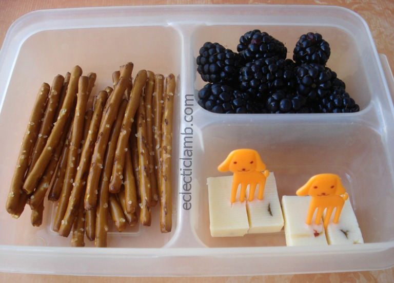 Food: Pretzel sticks, blackberries, jalapeno cheese slices