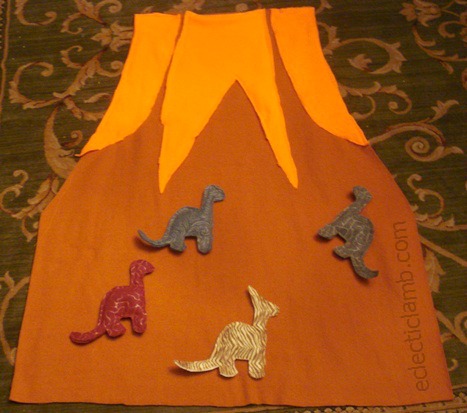 I sewed a volcano mat using fleece. I followed these directions. It was my first time sewing fleece and my first time with a new sewing machine. It is not perfect but the result is fine. I used this template and modified it for the dinosaurs. I used decorative felt and filled them with dried lentils.