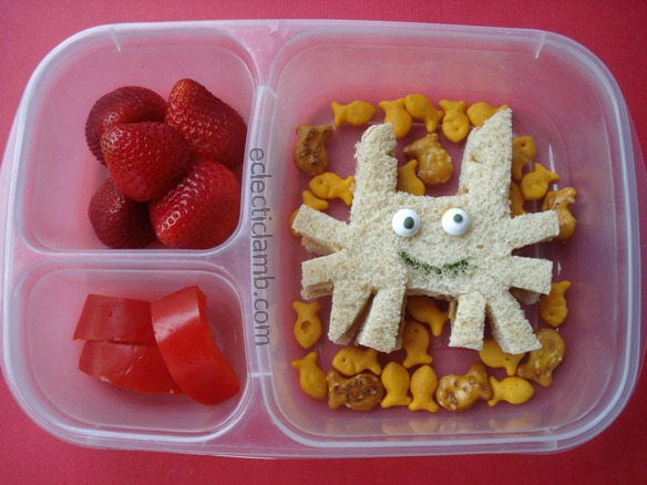 I made this lunch for my nephew who is almost five. I was running out of time so I quickly cut the sandwich freehand. I was going for shark but I think that it looks more like some type of fish. My nephew did not mind, he gobbled up this lunch.