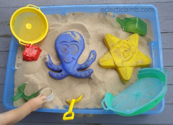 I created a quick sandbox from a plastic tote. We added some sand toys and plastic gold coins to find in the sand. It was a rainy day so we played on my side porch.