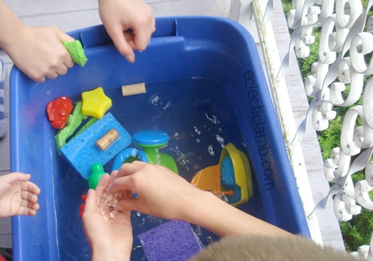 I created a water table of sorts from a plastic tote. Old and young kids all enjoyed this so much! We had things that floated (sponges, cork, plastic boat, watering can) and things that sunk (flat marbles). This activity was a huge hit!