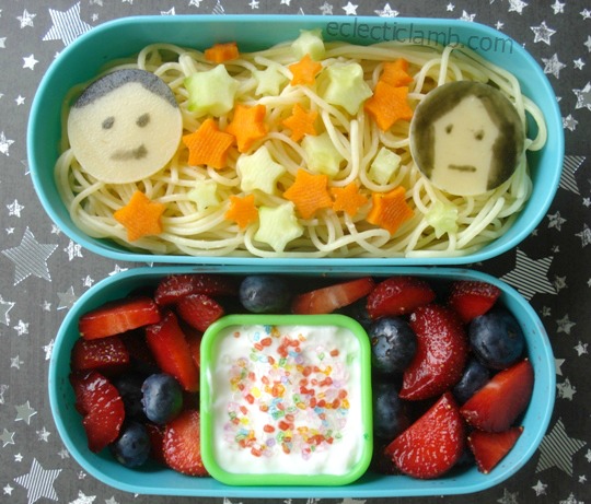 Milky Way: Angel hair pasta with a little butter and Parmesan cheese, carrot and cucumber stars