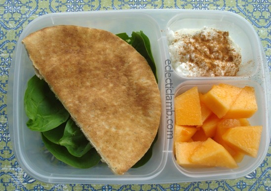 I needed to go shopping so this lunch was made from what I had in the house. The pita was in my freezer. Thrown together lunches can be interesting and delicious!