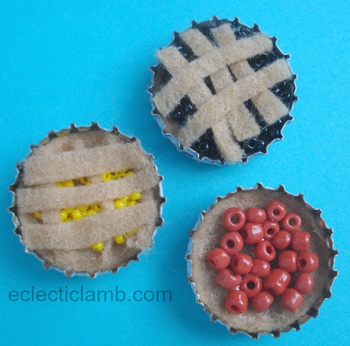 We also followed these directions and made miniature pies with bottle caps, beads, and felt.