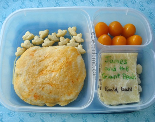 This lunch is very simple but it is how I would have drawn it as a child. It portrays the seagulls carrying the peach in the sky. You can imagine what is inside the peach. That was my favorite part as a child, thinking about James, Centipede, Miss Spider, Old-Green-Grasshopper, Ladybug, and Earthworm interacting inside a peach.