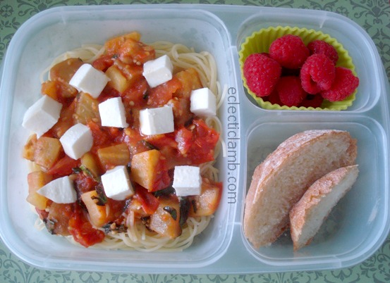This was an tasty dinner turned into delicious leftovers for lunch. I love eggplant but my husband doesn’t so I had this for dinner with my parents when he was working. I put the fruit in a silicone cup so it would be easy to heat up this lunch in a microwave. I like the texture of fresh mozzarella melted but I know that some people don’t.