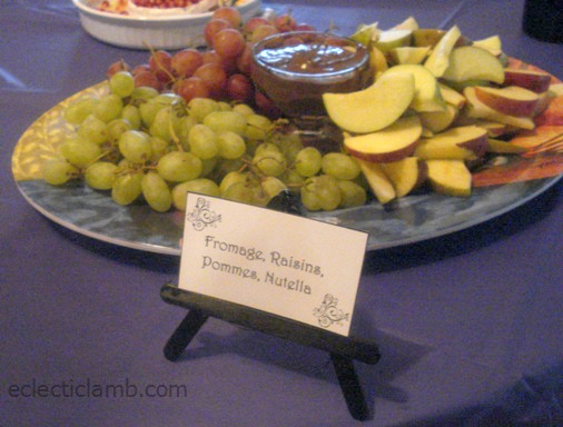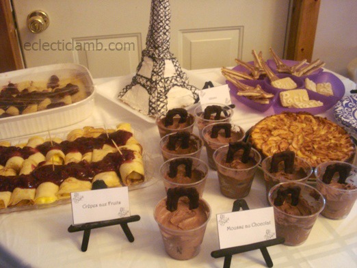 The table settings and food look great! Lovely party, and the Eiffel Tower cake is awesome!