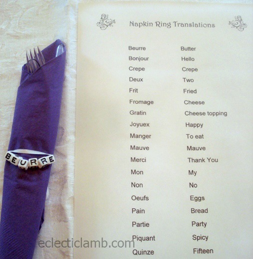 - French words napkin rings (I used alphabet beads to spell French words and threaded them twice on ribbon to minimize beads getting all over the place at the party. During the process I used a mini muffin pan to organize the words. I made a translation sheet to help people decipher their napkin ring.)