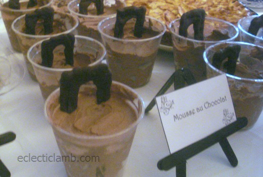 - Individual Mousse with Arc de Triomphe chocolate garnish (I melted a semi-sweet chocolate bar, put it in a Ziploc bag, snipped off the end and piped the shapes onto parchment, and put it in the freezer)