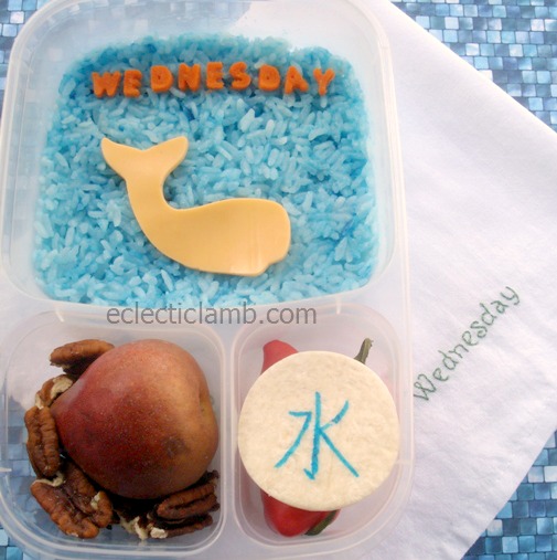 Wednesday is water day. It is named after the planet Mercury which is related to water. I colored the rice to represent water and added a whale. I drew the character for water on a flour tortilla with a food marker.