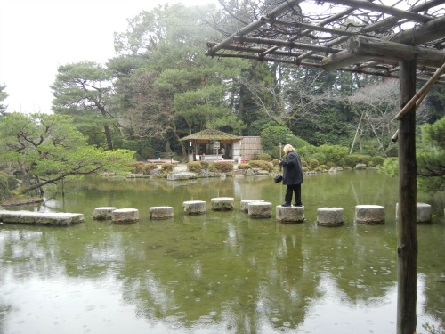 My Mom is an adventurer. Me, not so much. I think that this photo is so funny because it shows me watching and not participating while she is on an adventure. I walked around on the path while my Mom walked on the stepping stones across the pond. I was afraid that I would fall.