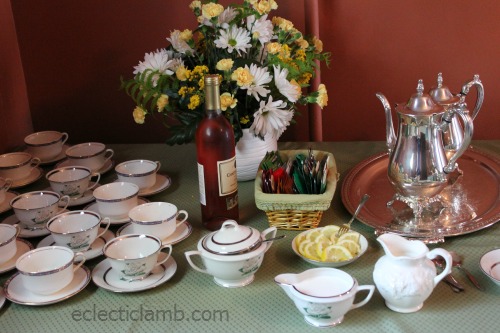 I wanted to use tea cups and saucers. I had 12 from my great-grandmother’s set. I borrowed 11 from my mother-in-law. I borrowed the silver tea service from my mom. This was my first time using a tea service. Before the party I Googled how to use it. Basically you need to figure out what will work for you. In my case because of the number of guests, I used a separate carafe for coffee. I used both of the silver tea pots for tea. I think that it is poor because I was the party host but I ended up not pouring the tea. I became busy with something and a guest poured for me. If I host this party again next year, I will need to make sure I take on the task of pouring the tea.