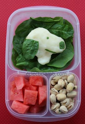 Top: Snoopy mashed potato (I added some butter, shredded cheddar cheese, and a little milk), spinach details and background