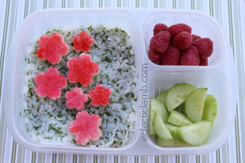 Left Side: Cheddar cheese cherry blossoms (used two sizes of cherry blossom cutters, Wilton Pink Gel Food Color), rice with chopped fresh parsley and lemon juice