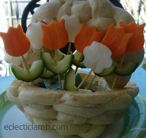 I made this tulip vegetable filled edible basket for my neighbors. It was previously published here.