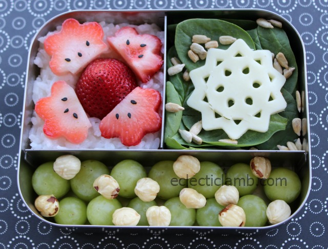 Top Left: Strawberry rice – I pushed a whole strawberry into the center of the rice. I used the blossom cutter to cut strawberry slices and decorated with black sesame seeds.