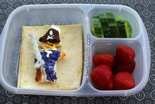 Left Side: Lego Pirate (Naan bread covered with cream cheese, painted on food coloring for face and body, peg-leg is cinnamon, white candy melt eye and detail on shirt, semi-sweet chocolate hat with white chocolate skull, sword is white candy melt with a little black food coloring), cheese quesadilla (background)