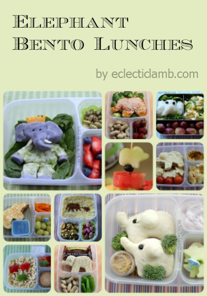 Today is Elephant Appreciation Day so it seems like a perfect time to share elephant shaped food. Today I have 7 new food ideas with elephants and 3 previously published ones. Elephants were my sister’s favorite animal when we were growing up. Her favorite stuffed animal was Ellie the elephant. I used many different techniques in this compilation: sculpted mashed potatoes, cookie cutters (pizza, sandwich, vegetables, fruit, pancakes, tortilla chips), stencil, homemade bread, and rice ball.
