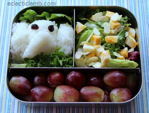 Top Left: Elephant onigiri (rice ball), dried blueberry (eyes), lettuce