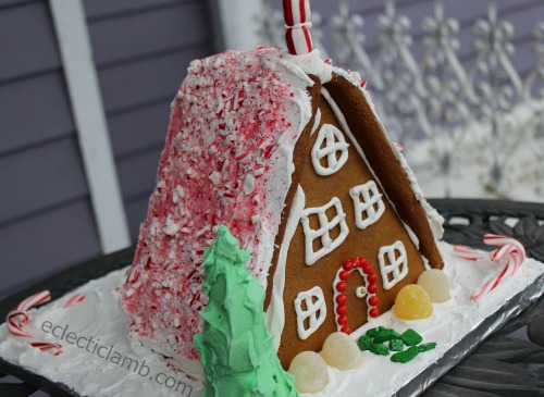 My nephew had fun crushing the candy canes for me. We put them in a large Ziplock bag and he used my marble rolling pin to crush the candy canes. It made a lot of noise but it smelled great and he had a good time. I made a mess while putting the crushed candy canes on the freshly frosted roof (I had wax paper underneath and tilted my house but candy cane pieces went everywhere including on my floor). But I am very pleased with the look.