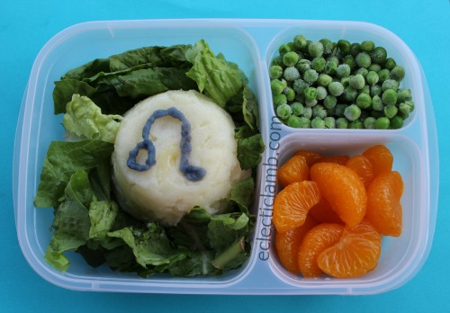 Left Side: Mashed potato with white cheddar cheese molded in a custard cup, blue mashed potato piped on top in the shape of the Leo symbol, lettuce