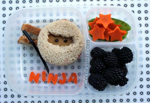 Left Side: Ninja peanut butter sandwich on wheat bread (I used a round cutter to cut the bread), eyes (mini chocolate chips), crust from the bread, plastic sword, carrot lettering (I decided not to “glue” down the carrots with peanut butter and my nephew did a word scramble and figured out on his own what it spelled)