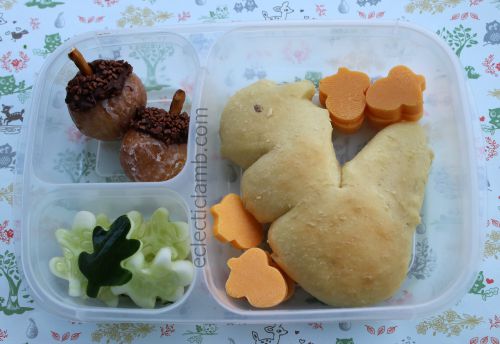 Right Side: Homemade bread shaped as a squirrel with food marker detail, Cheddar cheese acorns (used cookie cutter)
